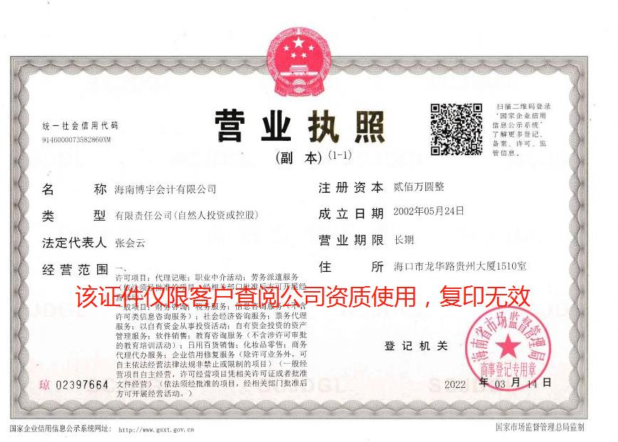 海南博宇会计有限公司是海南专业财税代理机构,已有二十多年的财税服务经验,是行业的先行者。秉承“专业,诚信,热情“的经营理念,累计服务客户60000+。公司拥有一支由高级会计师、中级会计师、税务师、助理会计师等组成的会计团队。与银行、工商、税务、政府等部门有着良好的合作关系。凭借专业的技术和优质的服务,博宇赢得了客户一致的信赖和好评。
