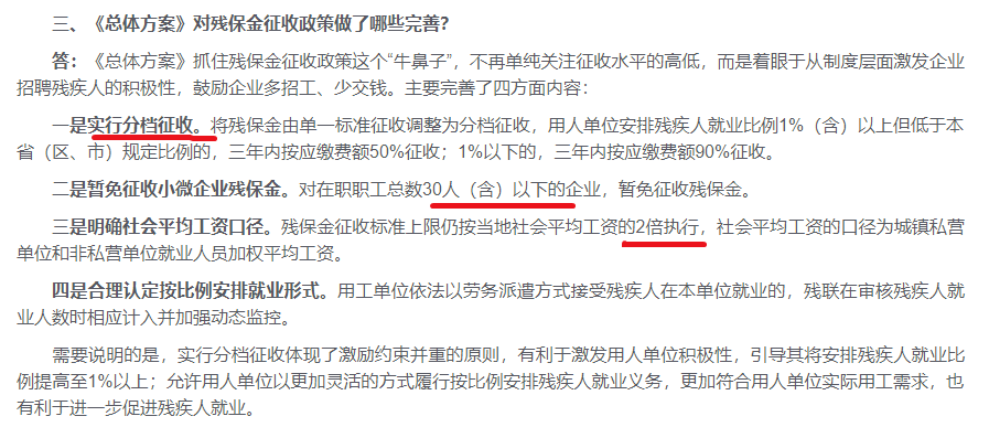 将残保金由单一标准征收调整为分档征收,用人单位安排残疾人就业比例1%(含)以上但低于本省(区、市)规定比例的,三年内按应缴费额50%征收;1%以下的,三年内按应缴费额90%征收。