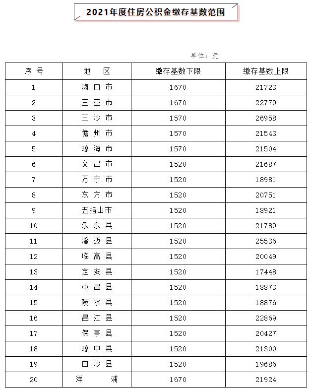 根据《住房公积金管理条例》及相关规定,依据《海南省人力资源和社会保障厅关于调整海南省2018年最低工资标准的通知》及省统计局公布的2020年相关在岗职工年平均工资,现就2021年度海南省住房公积金缴存基数范围通告如下: